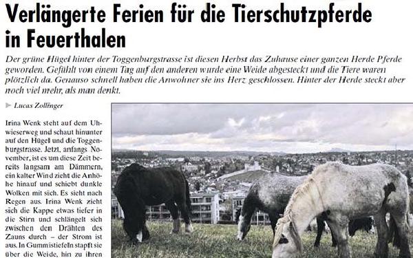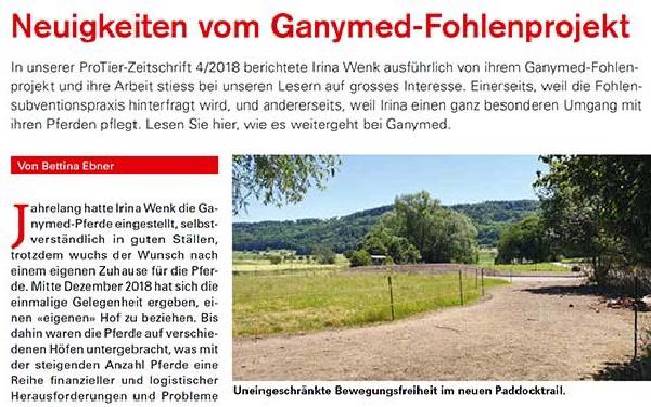 Medienbeiträge Ein Hof für Pferde, die keiner will Schaffhauser Nachrichten Artikel lesen (pdf) Neuigkeiten vom Ganymed-Fohlenprojekt ProTier 2/19 Artikel lesen (pdf) Pferdefohlen wollen leben (2018) ProTier 4/18 Artikel lesen (pdf) Verlängerte Ferien für die Tierschutzpferde in Feuerthalen Feuerthaler Anzeiger Artikel lesen (pdf) Was will ein Pferd? Beobachter Artikel lesen (pdf)